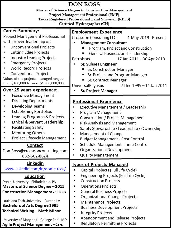 Mr. Ross has successfully lead and managed companies, divisions, projects and programs for over 25 years. During that time, he has mentored numerous professionals and has successfully lead $1 MM to $1 B Capital, Business, Operations and Construction Programs and Projects-All with a safety first mentality while meeting project goals, constraints and specifications.